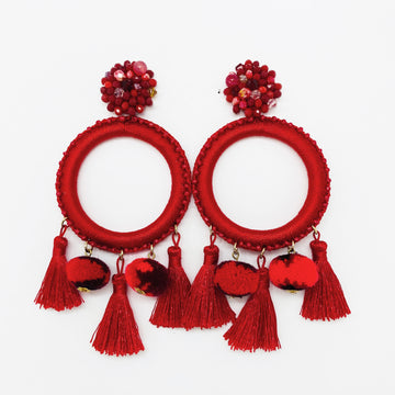 Aretes artesanales, tejidos y bordados a mano con cristales varios, pompones y borlas.