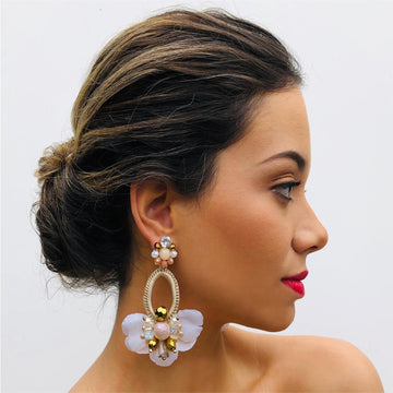Aretes artesanales, tejidos y bordados a mano con cristales varios, piedras mixtas y pétalos de seda acerados.