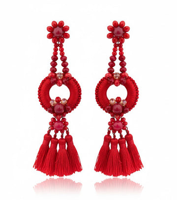 Aretes artesanales, tejidos y bordados a mano con cristales, piedras mixtas y borlas.
