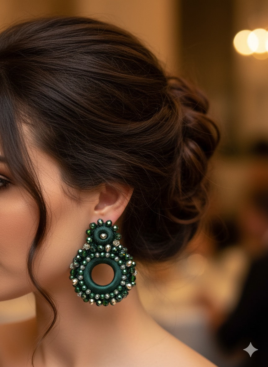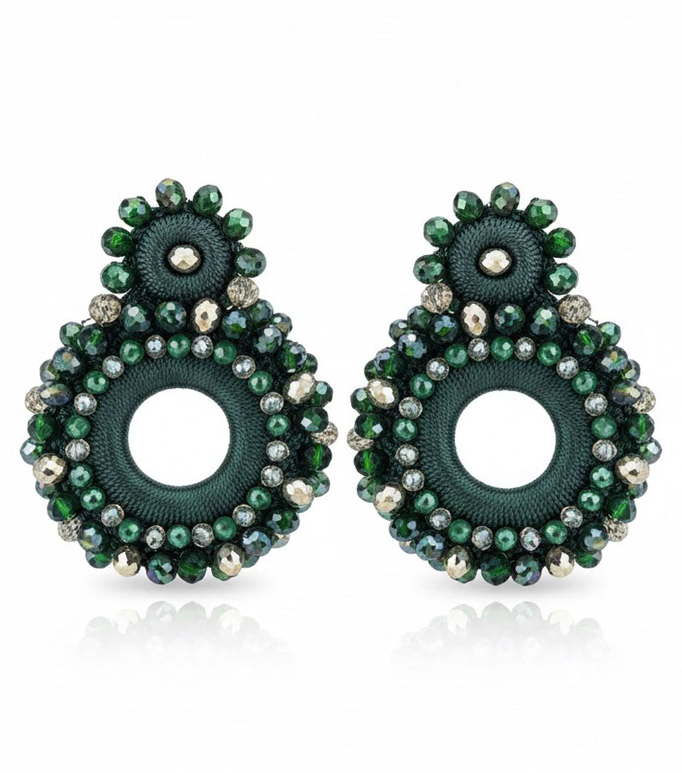 Aretes artesanales, tejidos y bordados a mano con cristales.