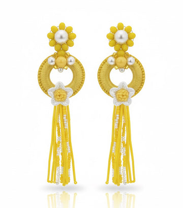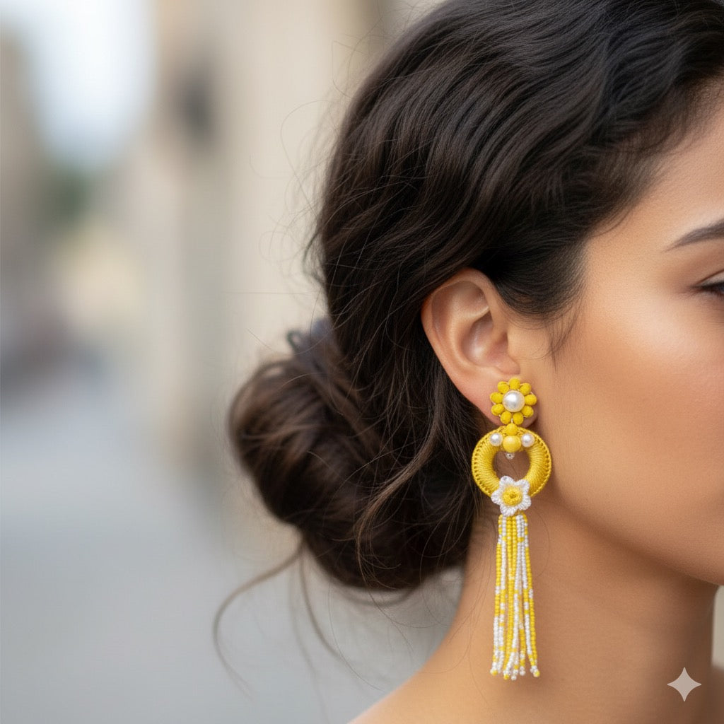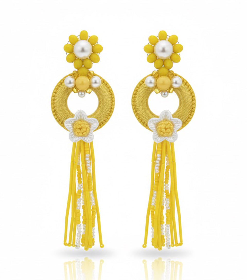 Aretes artesanales, tejidos y bordados a mano con cristales, piedras mixtas y borlas.