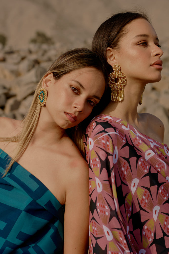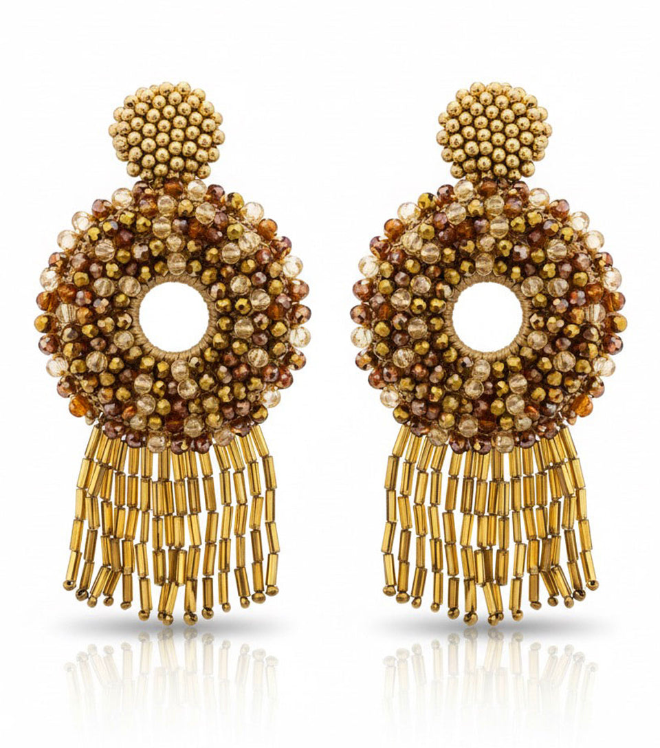 Aretes artesanales, tejidos y bordados a mano con cristales, bolitas de acero enchapado en oro de 24k, canutillos y mostacillas.