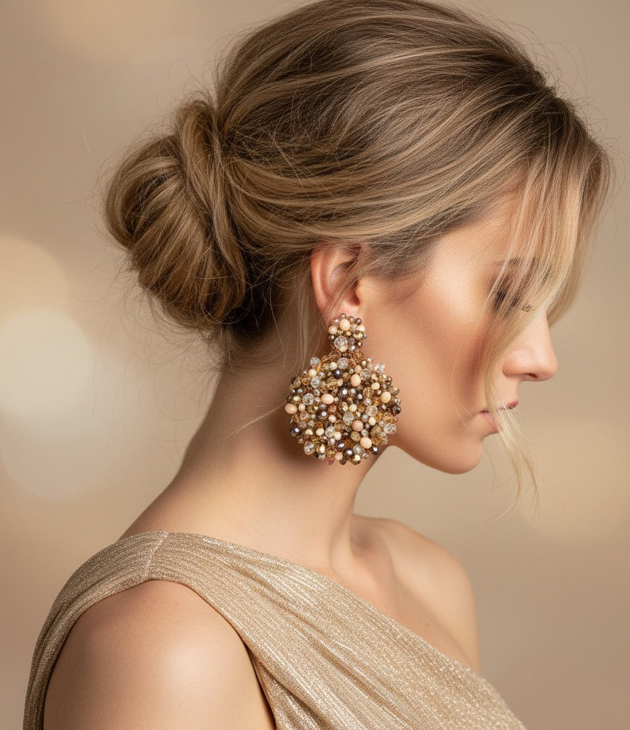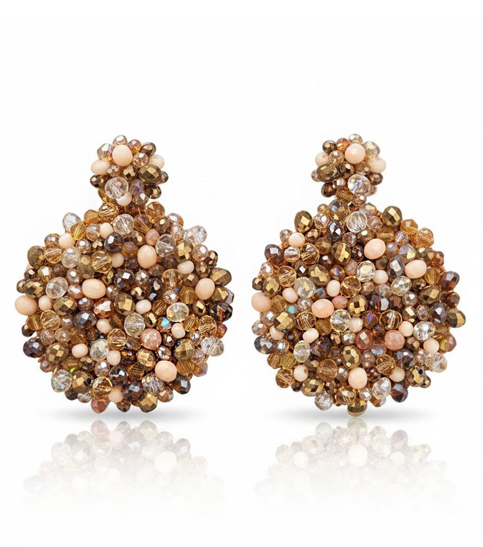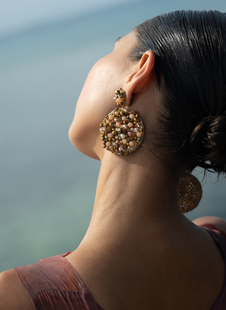 Aretes artesanales, tejidos y bordados a mano con cristales y piedras mixtas.
